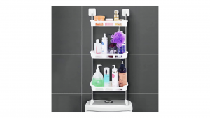 60% OFF at $15.99 Bathroom Organizer Over The Toilet Storage Shelf,Space Saver Adhesive Base Bathroom Shelves for Storage Toilet Paper Big Bottle Shampoos Kitchen Hanging Wall Shelf with Hooks